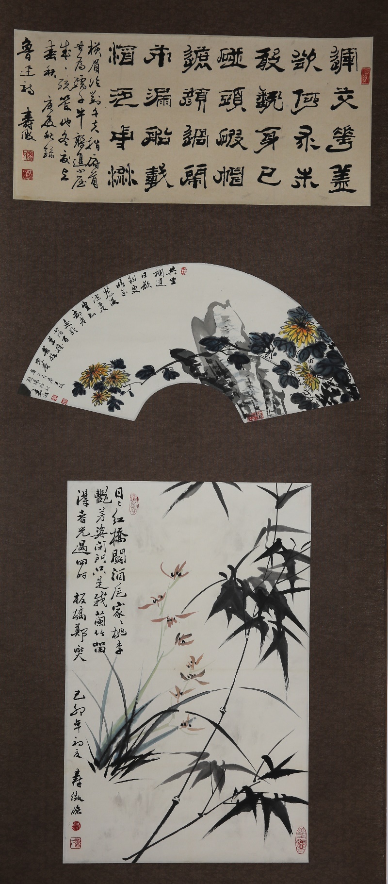书法鲁迅《自嘲》诗及绘画《扇面菊》《板桥竹》三组合(1999年创作)