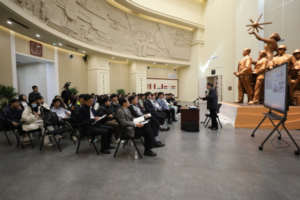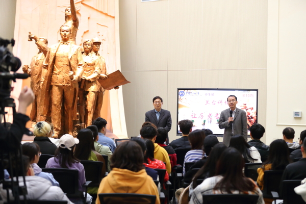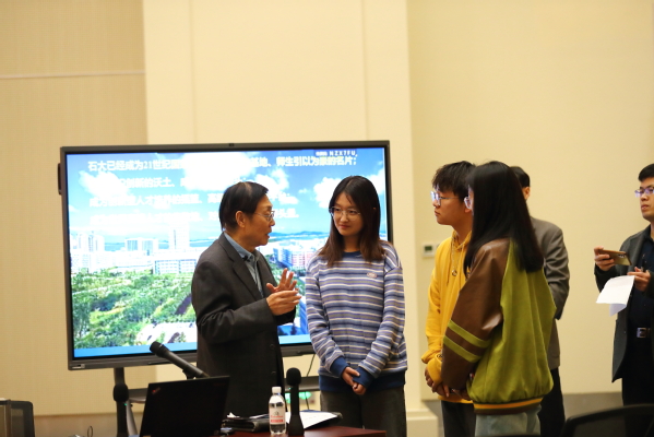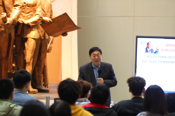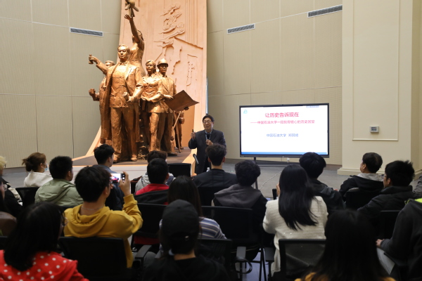 选课大学生、校史宣讲团大学生、新能源科学与工程专业2021级1班全体同学、70年校史和院史编写组专家、档案馆全体参加报告会。报告会在校史馆序厅举行,现场代表石大昨天、今天和明天的大型浮雕、人物雕铜和卷轴竖雕,让听众对石大校史有了沉浸式体会和感受。